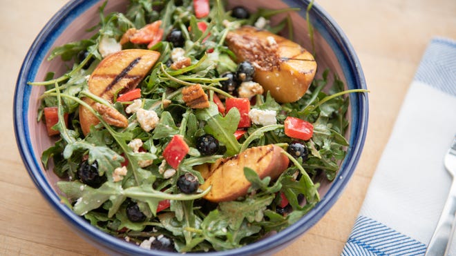 Celebrate August with a salad featuring peaches, blueberries and arugula